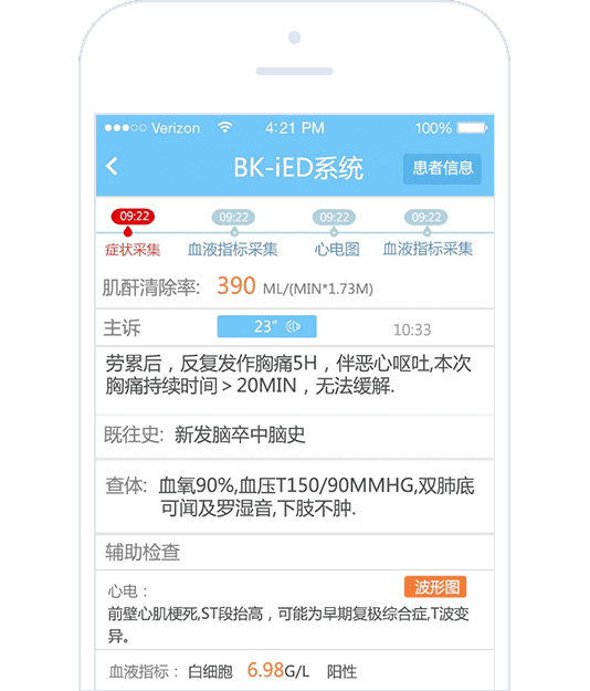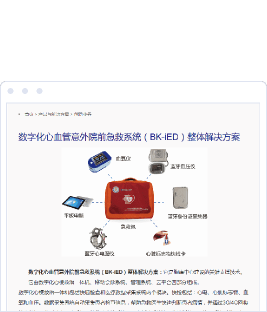 为北京倍肯恒业科技有限公司开发的心血管意外院前急救系统(App + Web管理后台 + 医疗器械)。团队完成软件系统方案的设计与开发,包括救护车Pad端、医生手机端、各种医疗检测设备的数据采集与处理、WEB管理界面、后台服务器等。