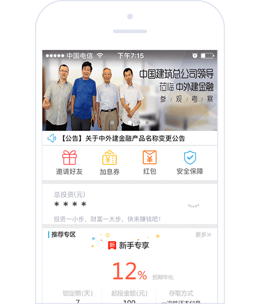 为中外建投资基金管理有限公司开发的P2P理财投资系统(App + Web管理后台)。团队完成整个系统方案的设计与研发,包括UI/UE设计、系统搭建、后台开发,APP开发,测试上线等。